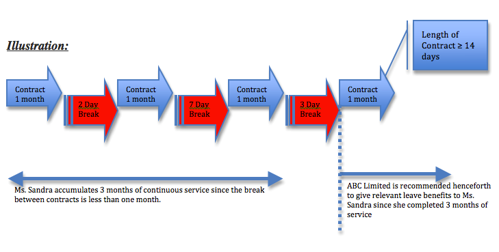 例如,ABC有限公司以合同形式雇用桑德拉女士。每份服务合同持续一个月,每份合同之间有不同的中断期,因此中断期不超过一个月。在签订了三份这样的合同,休息时间不超过一个月之后,她又被重新雇用了一个月。在完成累计三个月的服务期后,任何超过14天的续签合同都将被视为连续服务期。桑德拉女士被视为已完成三个月的累计服务期。因此,建议ABC有限公司向Sandra女士提供相关的休假福利,因为她已完成三个月的服务。